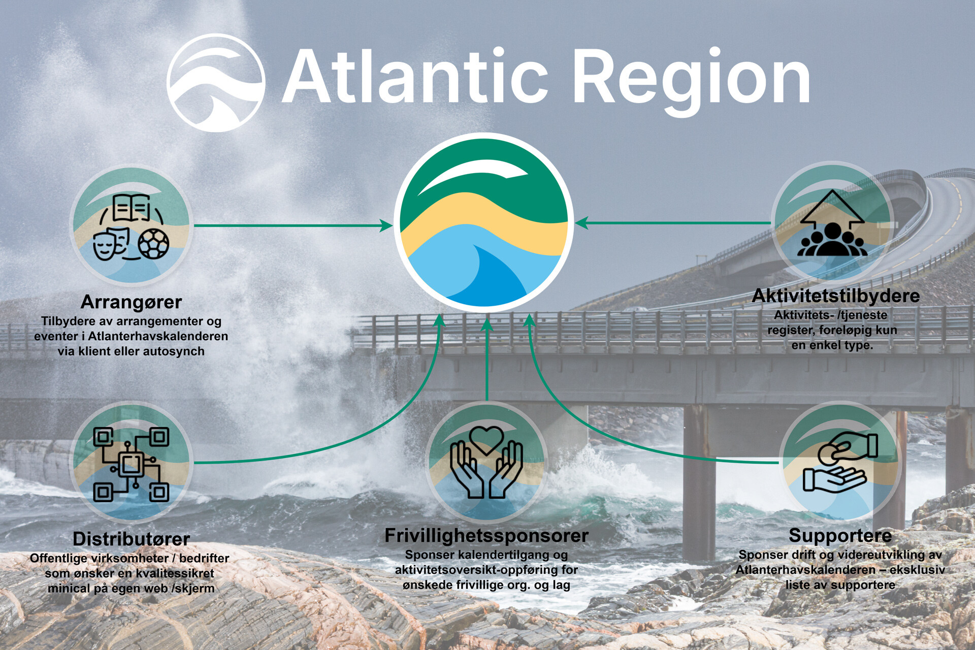 Velkommen til Atlanterhavsregionen og pilotprosjektet «Atlanterhavsportalen – Hva skjer i Atlanterhavsregionen». Formålet er å fremme og binde sammen Atlanterhavsregionen og medlemmenes økonomiske og ideelle interesser gjennom utvikling og bruk av en felles nettbasert opplevelseshub med formidling av aktiviteter og det som naturlig faller inn under dette.